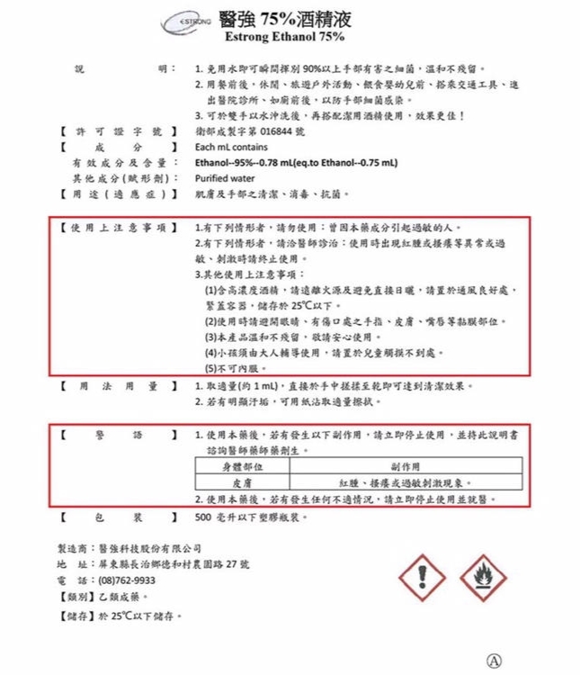 • 有效成分:Each mL contains: Ethanol -- 95% -- 0.78ml (eq to Ethanol -- 0.75 ml)