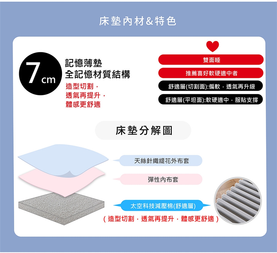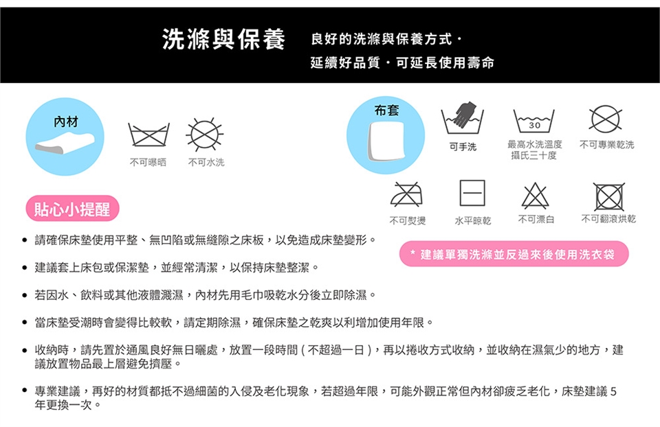 ◆洗滌方式:床墊內材不可曝曬、不可水洗;布套建議單獨洗滌並反過來後使用洗衣袋。