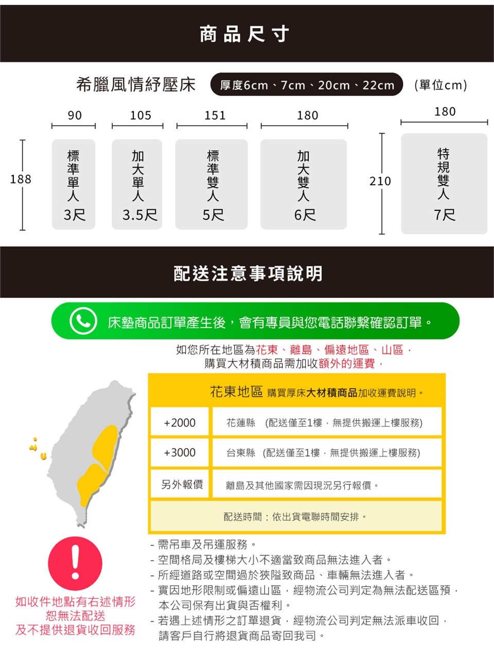 ◆送達地點有否限制:限台灣本島地區,大材積商品花東地區、離島、偏遠地區外需另加收運費,若因特殊地形無法配送,本公司保有出貨與否權力,外島地區恕不接單。