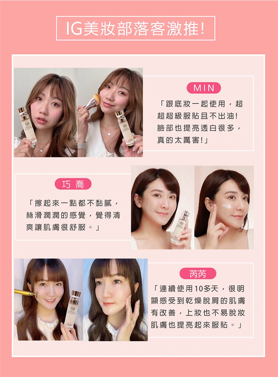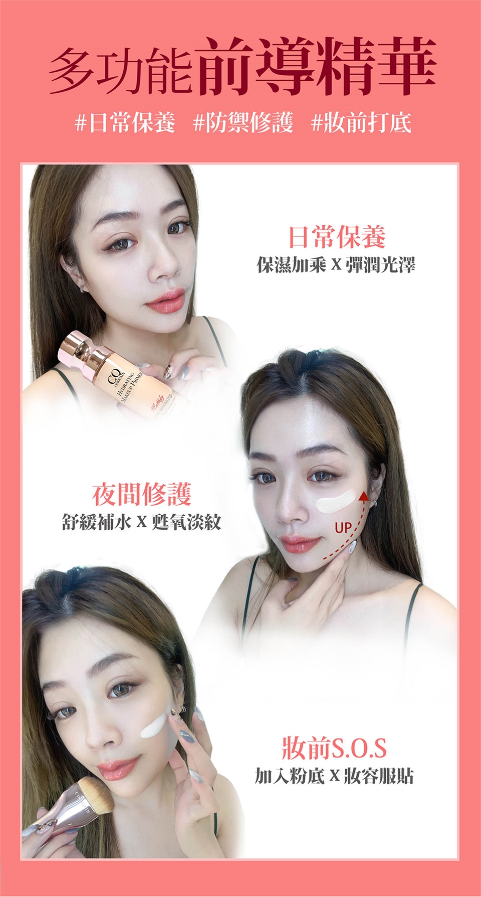 一般保養程序後,底妝前使用,取適量塗抹於全臉。亦可與粉底液調和使用。