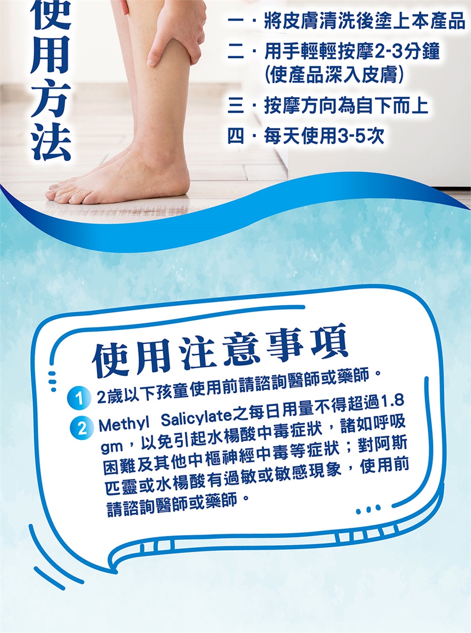‧Methyl Salicylate之每日用量不得超過1.8gm,以免引起水楊酸中毒症狀,諸如呼吸困難及其他中樞神經中毒等症狀;對阿斯匹靈或水楊酸有過敏或敏感現象,使用前請詢醫師或藥師。