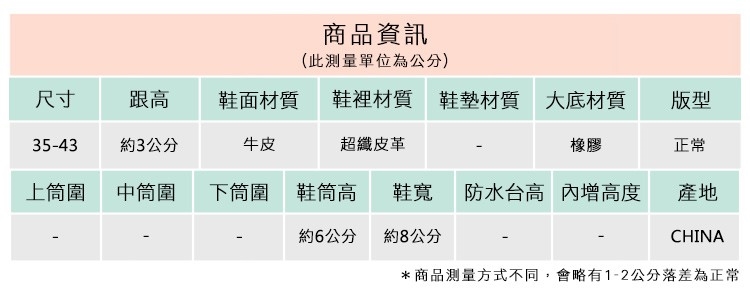2.鞋類商品依功能及用途之不同,鞋底各有其止滑係數之個別不同,使用鞋類商品請用於正常平坦之路面,非雨鞋或雨靴類商品,請避免穿著於下雨濕滑路面上行走。