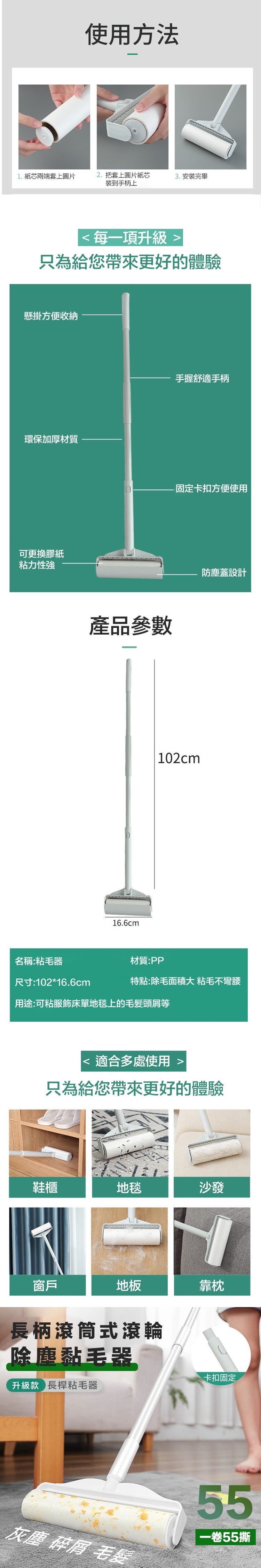 輕輕滾過髒處,輕鬆黏起毛髮或髒汙,附著表面灰塵、碎屑,滾筒式膠黏,黏著力超強不沾手,可補充,重覆使用超環保,優質黏塵紙,斜撕設計,隨手撕開輕鬆替換