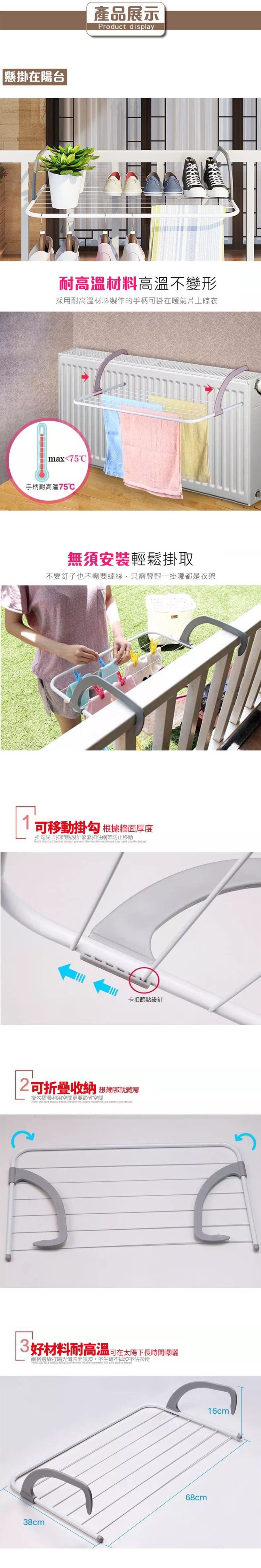 免安裝,一開即用,ABS防護設計,堅固又防滑,堅強管材厚度,可置於陽台、護欄上、窗台上也可懸掛在浴室增加擺放空間,一物多用,可移動掛架,掛勾卡扣點扣住網架,防止移動,可摺疊設計方便調整,不佔空間