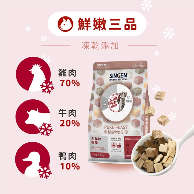 商品名稱:SINGEN 信元發育寶 貓用天然低敏無穀凍乾飼料-1.8kg+300g-添加牛肉 鴨肉 雞肉 貓乾糧 貓飼料 寵物飼料 極醇元食鮮嫩三品