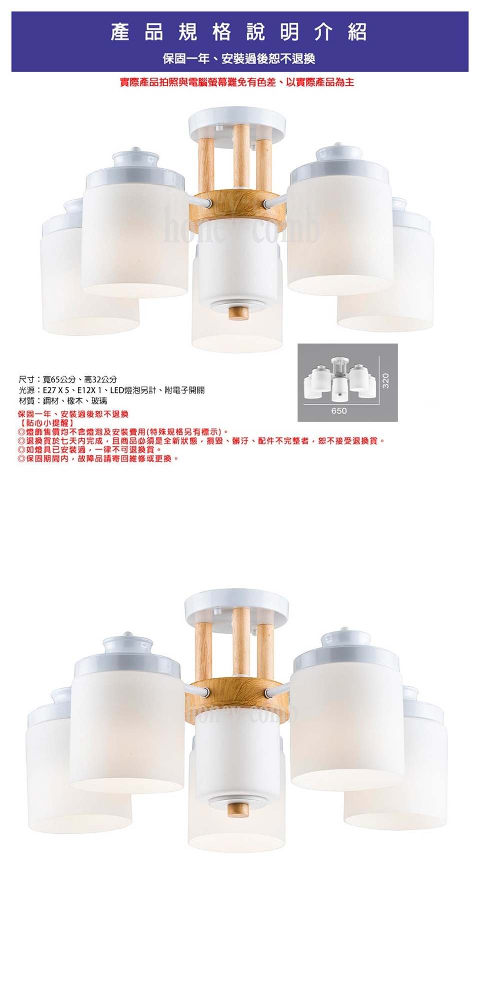 光源:E27 X 5、E12 X 1、LED燈泡另計、附電子開關