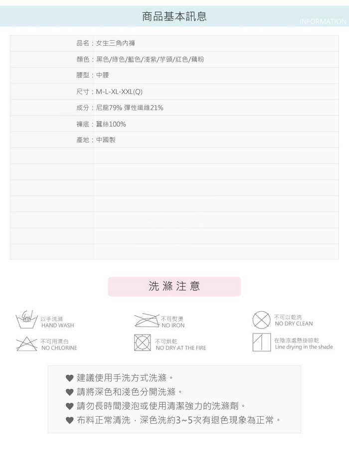 ‧洗滌時建議使用中性洗潔劑手洗,不可長時間浸泡再洗滌。
