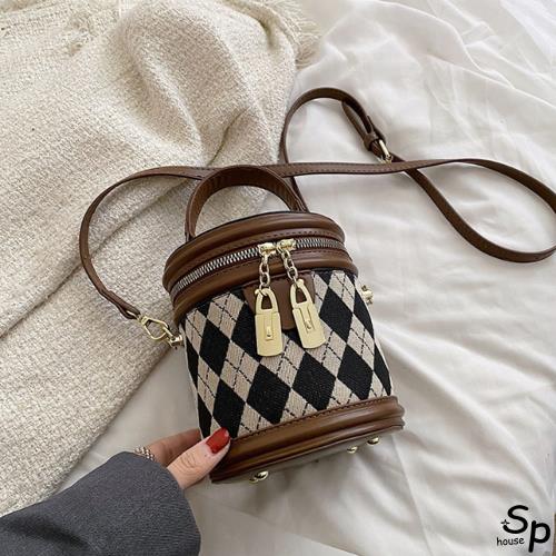 【Sp house】復古菱格鑰匙拉鍊金扣女士手提斜背包側肩包水桶包(3色可選)