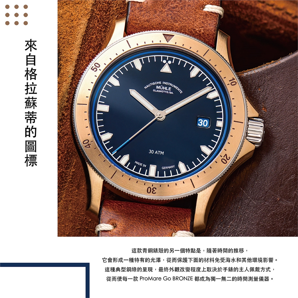 這款青銅錶殼的另一個特點是,隨著時間的推移,它會形成一種特有的光澤,這種典型銅綠的呈現,最終外觀改變程度上取決於手錶的主人佩戴方式,從而使每一款 ProMare Go BRONZE 都成為獨一無二的時間測量儀器。由於青銅鑲嵌的 60 分鐘刻度和三角形標記,佩戴者可以提前體驗這種未來的光澤。這些在雕刻後經過特殊處理,以加速這些特定區域的銅綠形成。