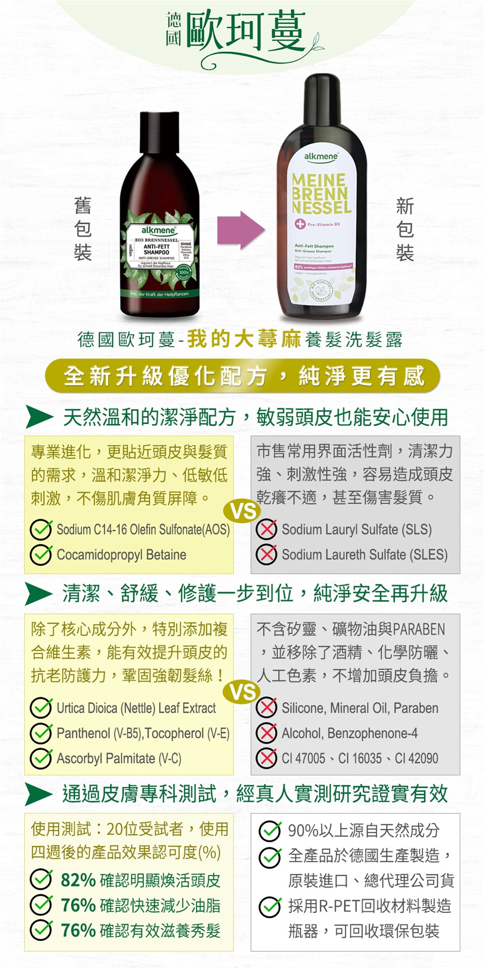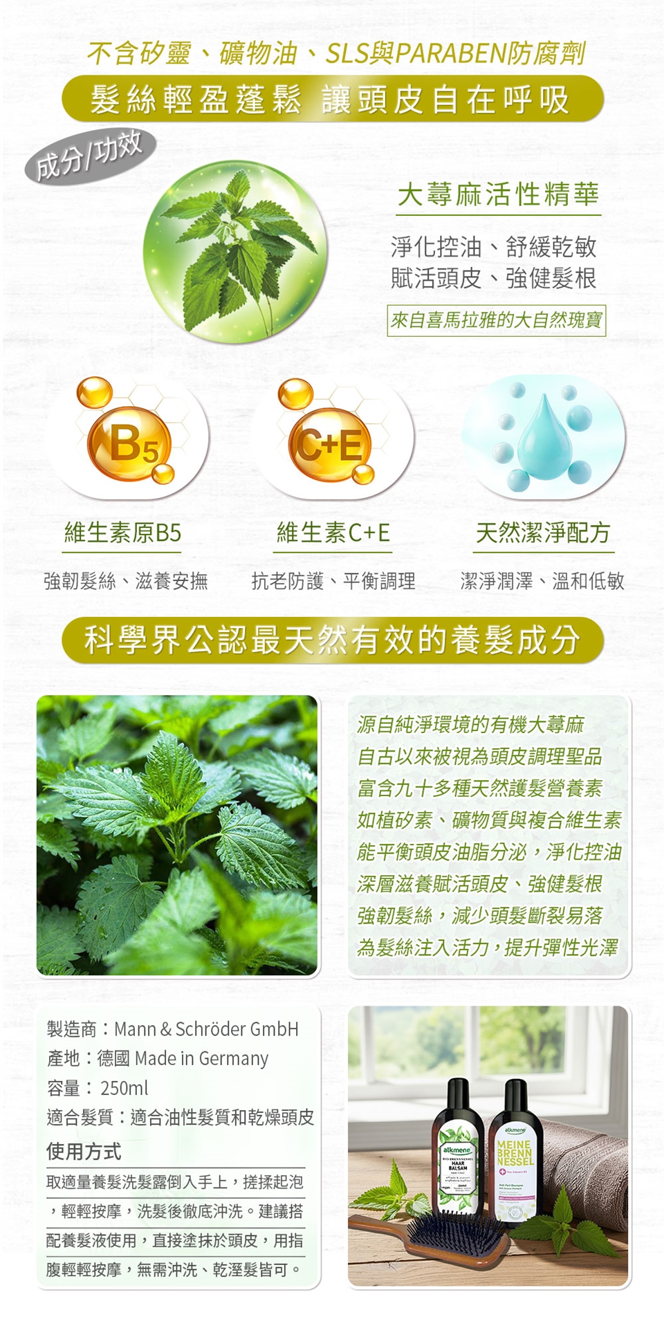 含多重胺基酸+大蕁麻萃取精華,異株蕁麻具有美容及保健等多種作用,尤其對頭髮很好。