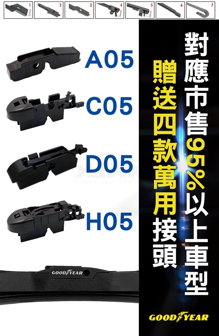 ● 內附四款萬用雨刷接頭,適用市售95%車種