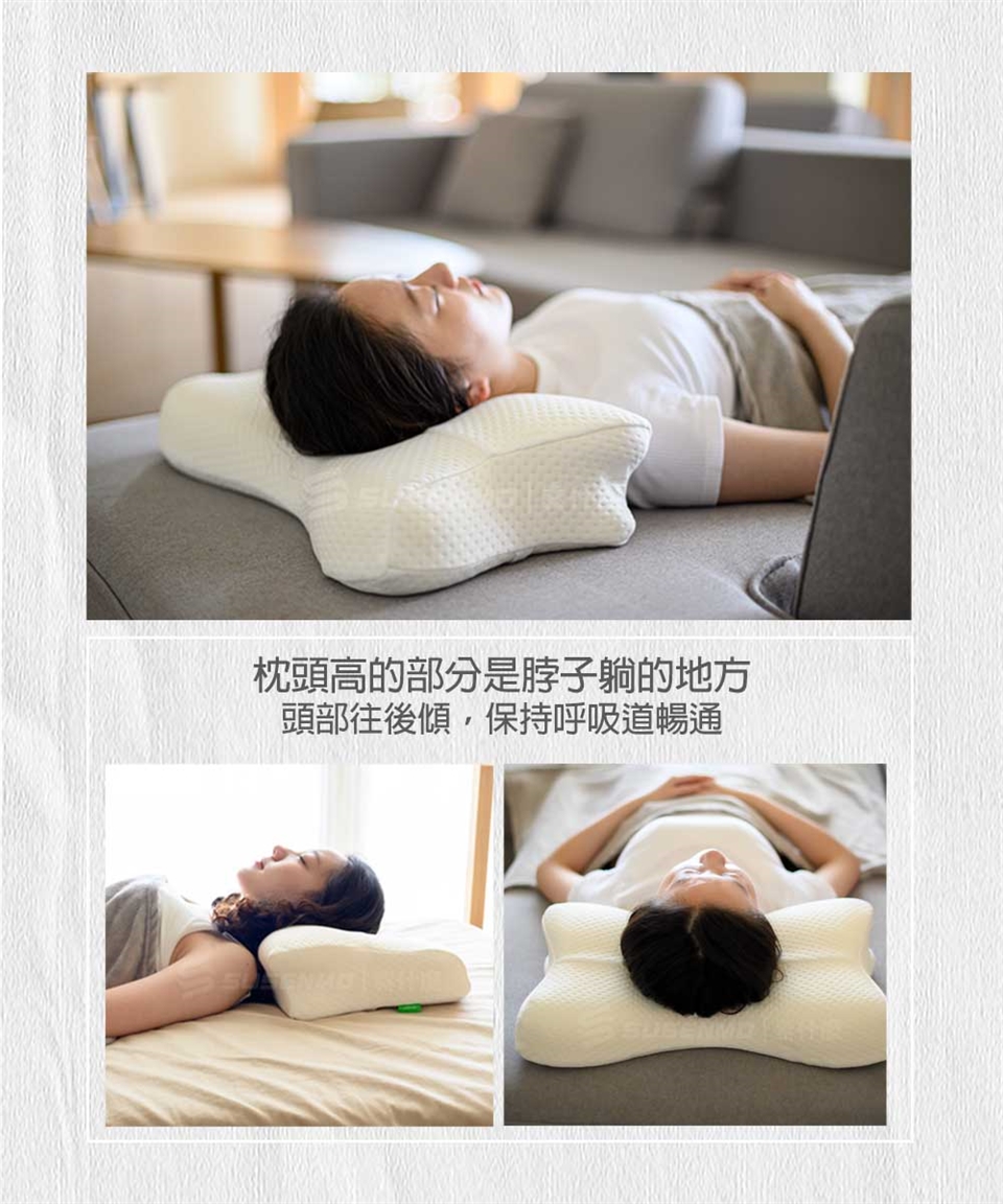 枕頭高的部分是脖子躺的地方,頭部往後傾,保持呼吸道暢通