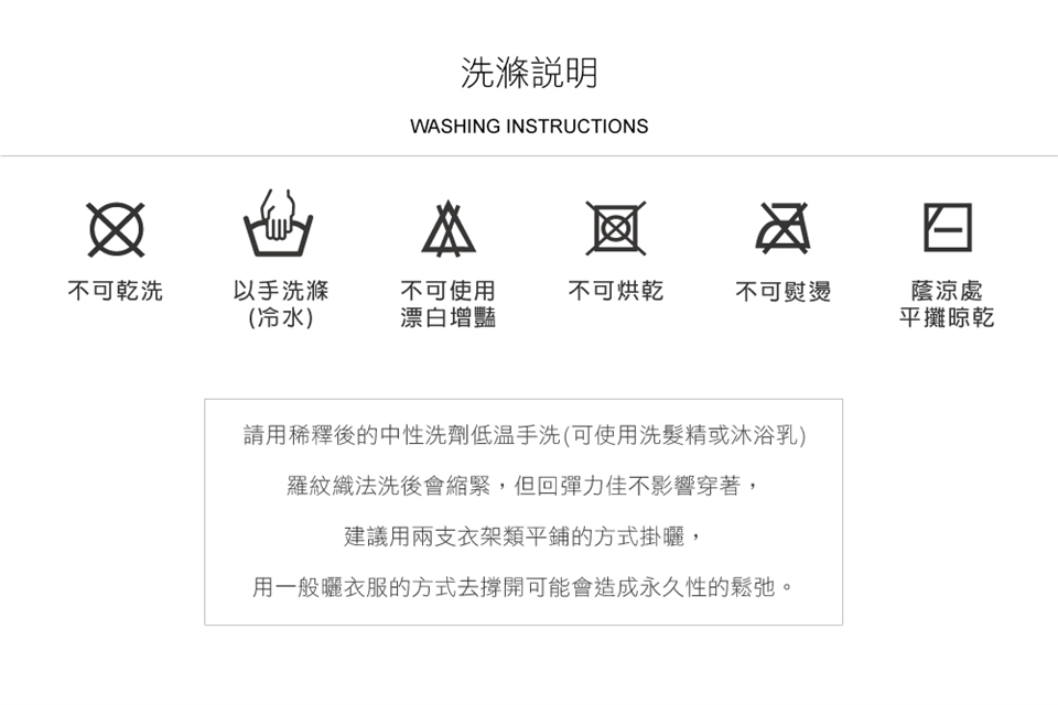 ► 建議可使用洗髮精、沐浴乳(可直接清洗皮膚之清潔產品)或蠶絲專用中性洗劑,使用低溫冷水稀釋過後,不浸泡,輕柔手洗方式進行清潔。