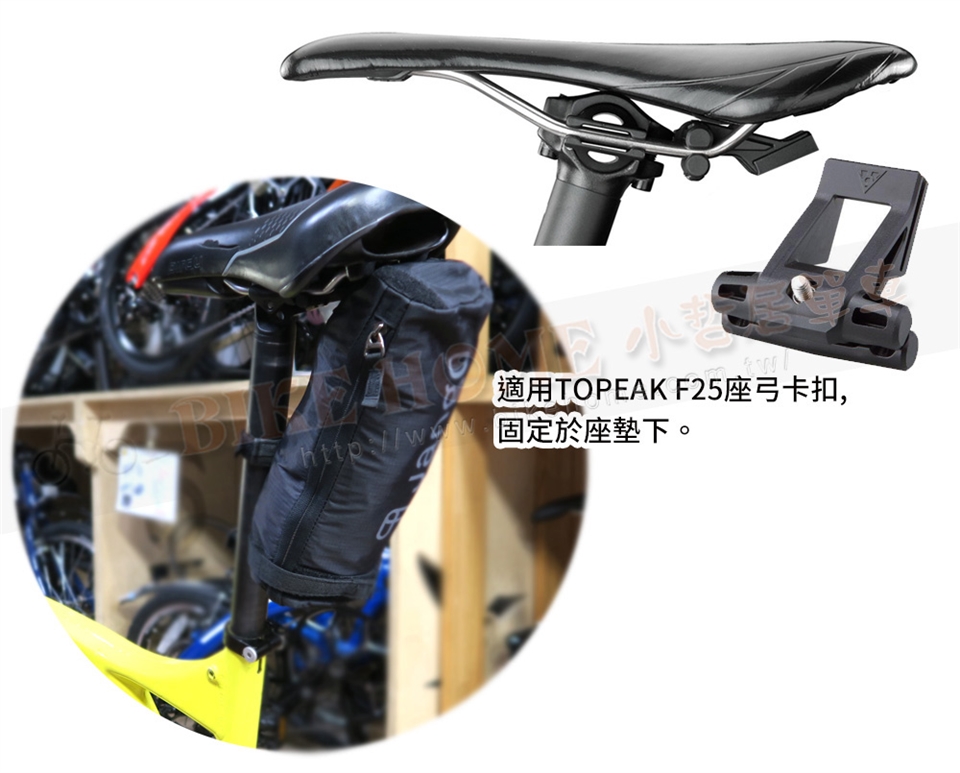 堅固的袋身設計,利用可調整長度的肩帶,完美的將Flik收納攜帶,可放置在汽車行李箱或是搭乘大眾交通工具。袋子折疊後可與TOPEAK F25座弓卡扣結合整合攜行。(TOPEAK F25卡扣需另購)