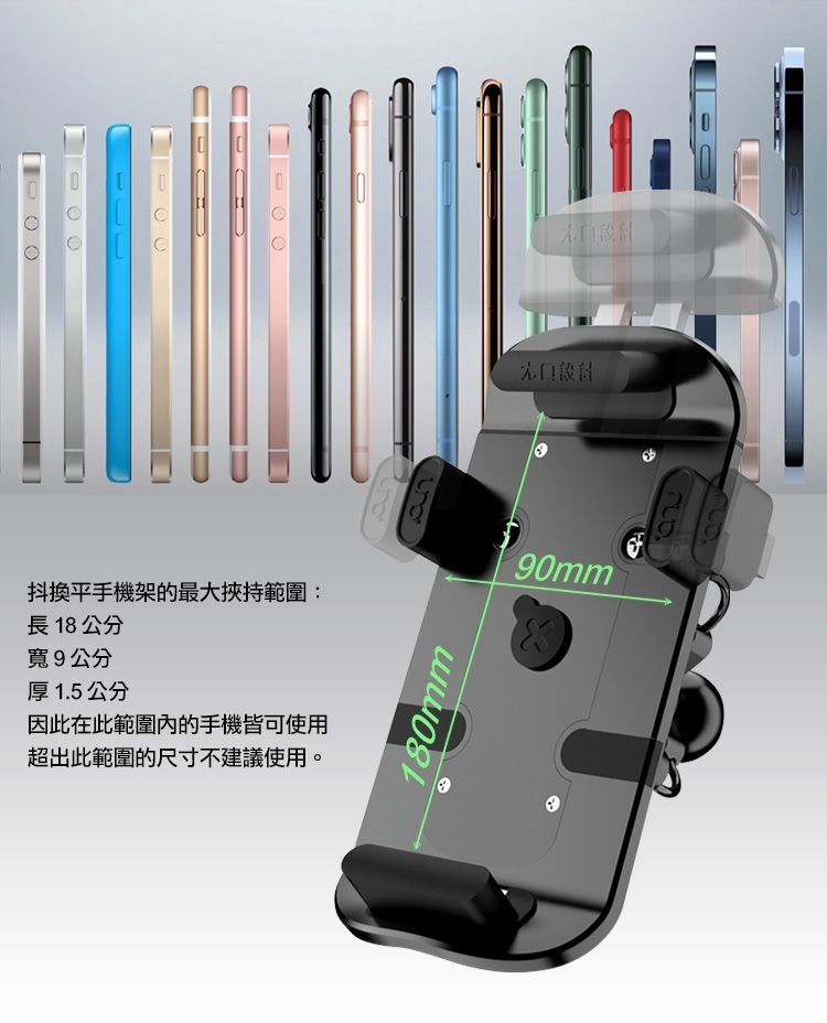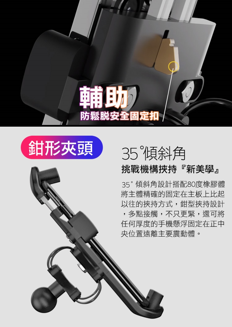 鉗型挾持設計,可將手機懸浮固定在正中央位置,遠離主要震動