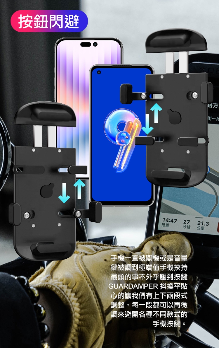 上下兩段式調整,不擋手機側邊按鍵