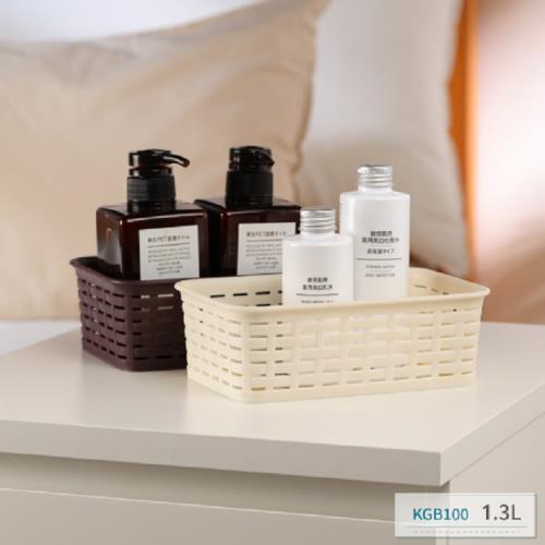 ◎ 柔和典雅色系,側面仿藤藝透孔設計,手把設計,便於拿取;亦可堆疊收納,有五種不同大小之產品,可供選擇,有簡約米、雅致咖啡色,可供挑選;其中藤藝100收納籃(KGB100),無手把設計。
