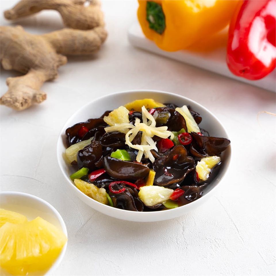 Q彈軟潤川耳加上薑絲、鳳梨,嚐起來酸中帶甜,再點綴紅黃椒及脆爽貢菜,形成多層次風味,顏色繽紛美觀,是一道色香味俱全的開胃料理。Q彈軟潤川耳加上薑絲、鳳梨,嚐起來酸中帶甜,再點綴紅黃椒及脆爽貢菜,形成多層次風味,顏色繽紛美觀,是一道色香味俱全的開胃料理。