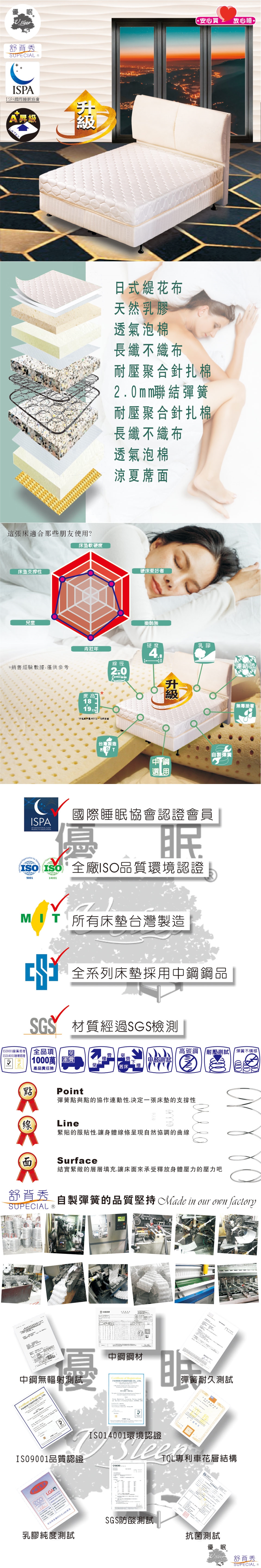 我們擁有ISO國際生產品質及環境認證的專業工廠及生產規範,勤勤懇懇,累積半個世紀的高級寢具及床墊用品製造經驗,我們的經驗就是品質的保證