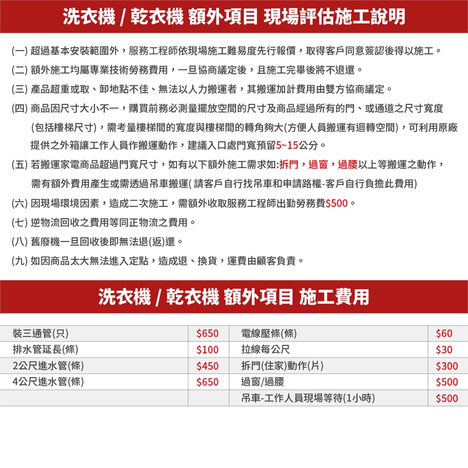※出貨後3-5個工作天,將會有安裝人員電聯確認安裝日期,如有額外施工費用可一同詢問。