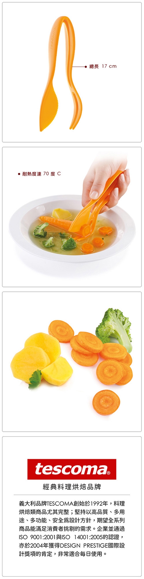 本商品一件入、耐熱度 70 度C,適用洗碗機。熱騰騰的濃湯上桌了,但湯裡的蔬菜不一定都切成適合孩童入口的尺寸,因此推薦您使用此款夾式餐刀,只要撈夾起欲分食的蔬菜,用叉端固定湯內的蔬菜,壓下餐刀便可將蔬果切割成方便入口的大小。適用水煮後的根莖類軟食,如胡蘿蔔、馬鈴薯、花椰菜等;鋸齒狀餐刀不過於銳利,簡易的使用方式讓家中小朋友可以自己動手剪切,讓餐點進食更加便利,且趣味的使用方式,能讓孩童增加對於食用蔬菜的意願。