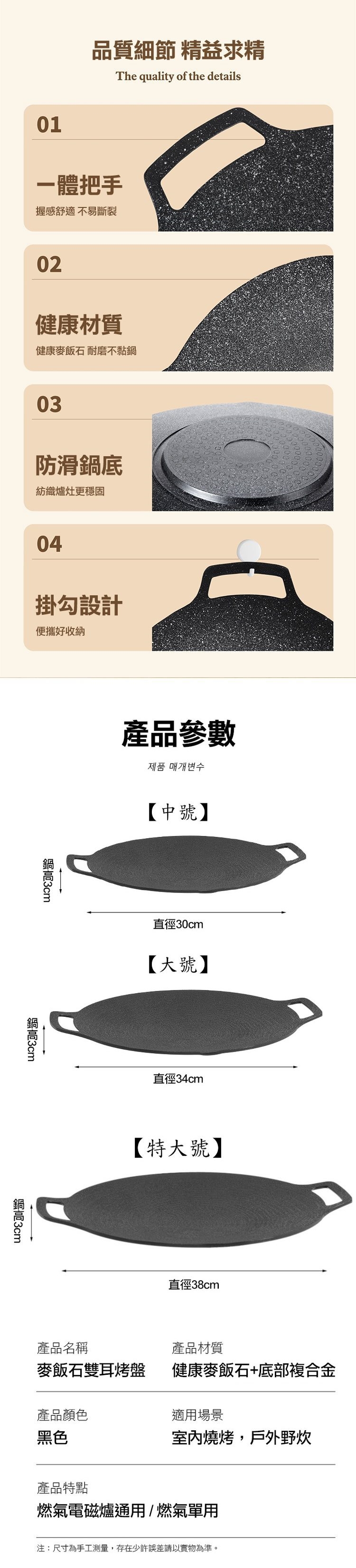 天然麥飯石材質,一體成形耐用不易沾黏,易清洗一沖即淨,健康少油煙,大理石重力鑄造,耐用不易損壞,盤型設計,外高內底,導熱迅速均勻,煎煮燒烤炒都OK,鍋身輕薄無負擔,戶外露營攜帶方便,可懸掛設計,便於收納,通風晾乾,節省空間不佔位