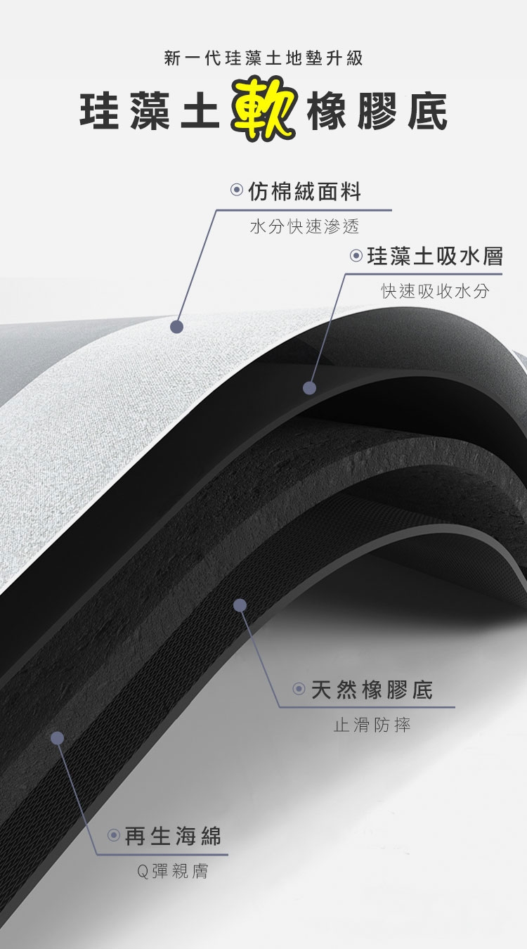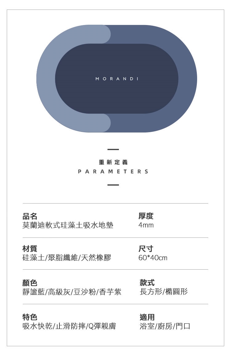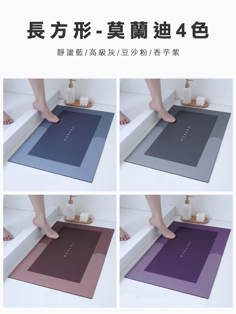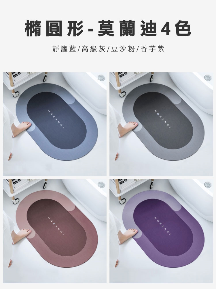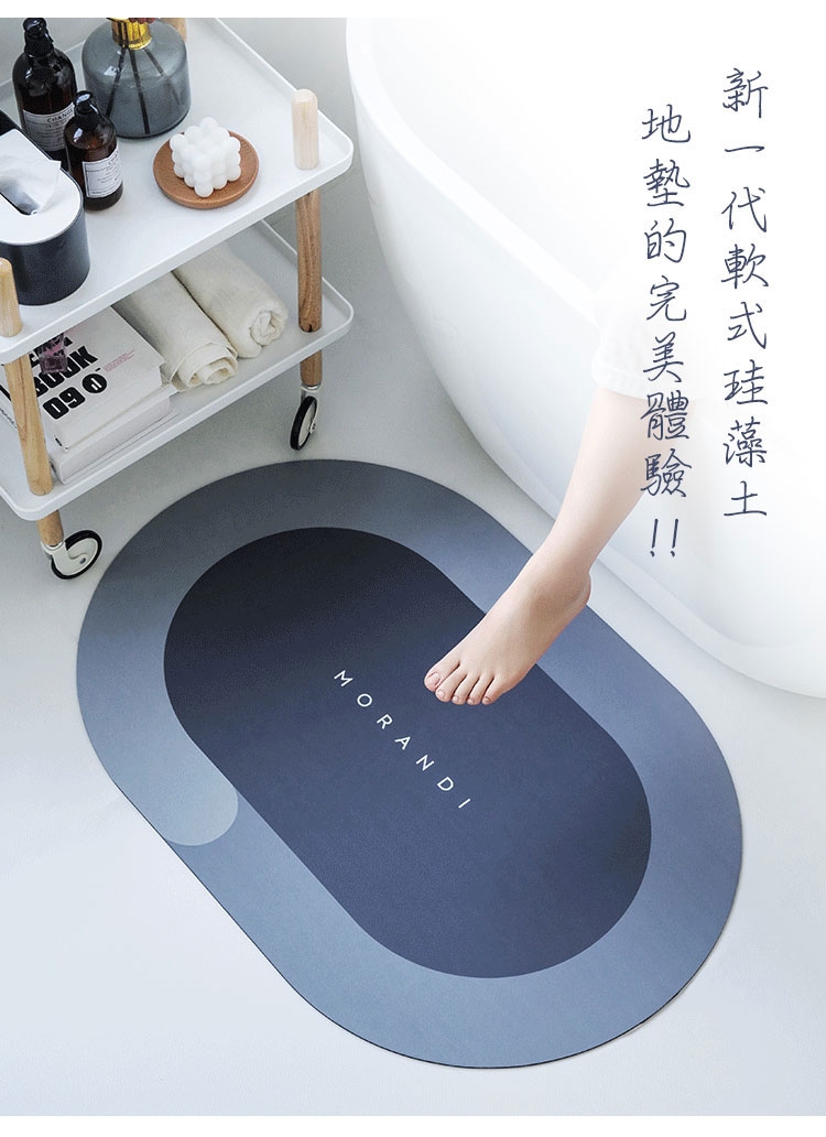 最新款 莫蘭迪軟式硅藻土吸水地墊 來嘍~改善你舊式硅藻硬式地墊,易髒還需砂紙磨刷的麻煩,全功能地墊 止滑耐磨、超薄輕盈、仿絨親膚、可剪裁、可捲收、好清洗~最新莫蘭迪色系長方型/橢圓型各四色,讓你居家好搭配~還有什麼地墊比它更好用!!!