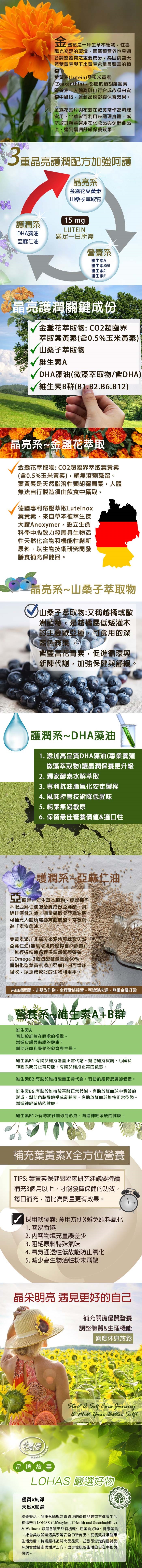 成分:亞麻仁油、金盞花萃取物(含酯化型葉黃素)、山桑子萃取物(麥芽糊精、山桑子萃取物)、葡萄糖酸鋅、中鏈三酸甘油脂(MCT)、微藻萃取物(含DHA)、維生素C、酵母硒、維生素E、維生素B6、維生素B1、維生素B2、維生素A、維生素B12、膠皮成分(明膠、甘油、純水、二氧化鈦、食用紅色六號、食用黃色四號、食用藍色一號)。