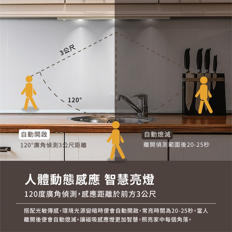 紅外線人體動作感應,120度廣角偵測,感應距離於前方3公尺。搭配光敏傳感,環境光源變暗時便會自動開啟,常亮時間為20-25秒,當人離開後便會自動熄滅。讓磁吸感應燈更加智慧,照亮家中每個角落。