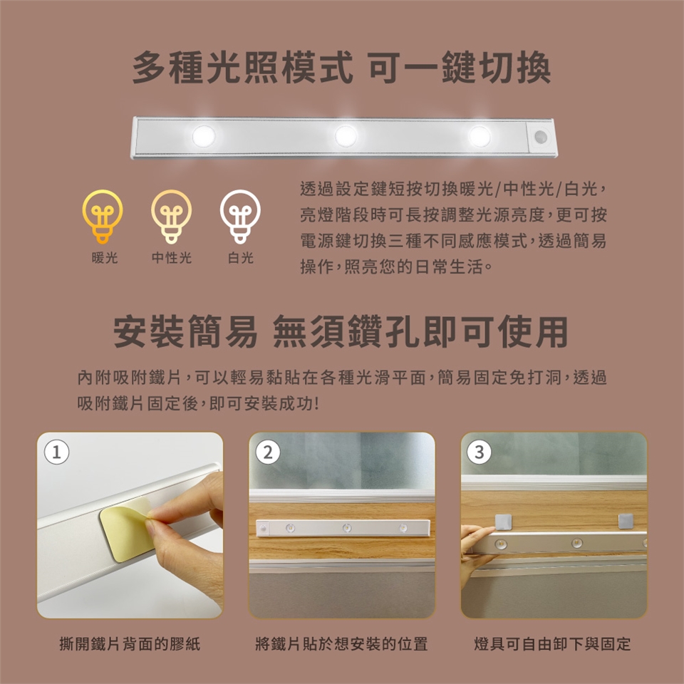 LED智慧磁吸感應燈,可透過設定鍵短按切換暖光/中性光/白光,亮燈階段時可長按調整光源亮度,更可按電源鍵切換三種不同感應模式,透過簡易操作,照亮您的日常生活。