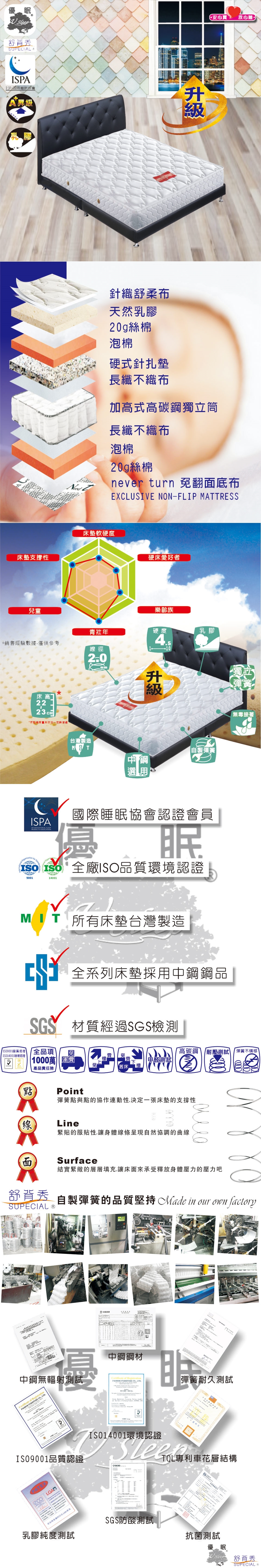 我們從鋼材,泡棉,乳膠,表布,接著劑,從內到外皆採用無毒,無輻射材質,真心把每一張床墊做到最好是我們唯一的堅持