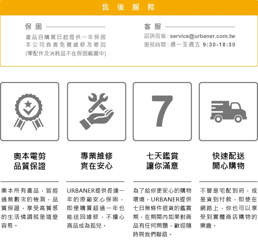URBANER奧本電剪官網提供十天鑑賞期,如使用後欲退換貨,請將商品及包裝完整保留後申請。非人為因素造成損壞,享免費維修保固一年。