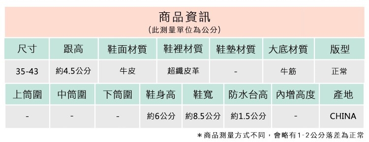 2.鞋類商品依功能及用途之不同,鞋底各有其止滑係數之個別不同,使用鞋類商品請用於正常平坦之路面,非雨鞋或雨靴類商品,請避免穿著於下雨濕滑路面上行走。