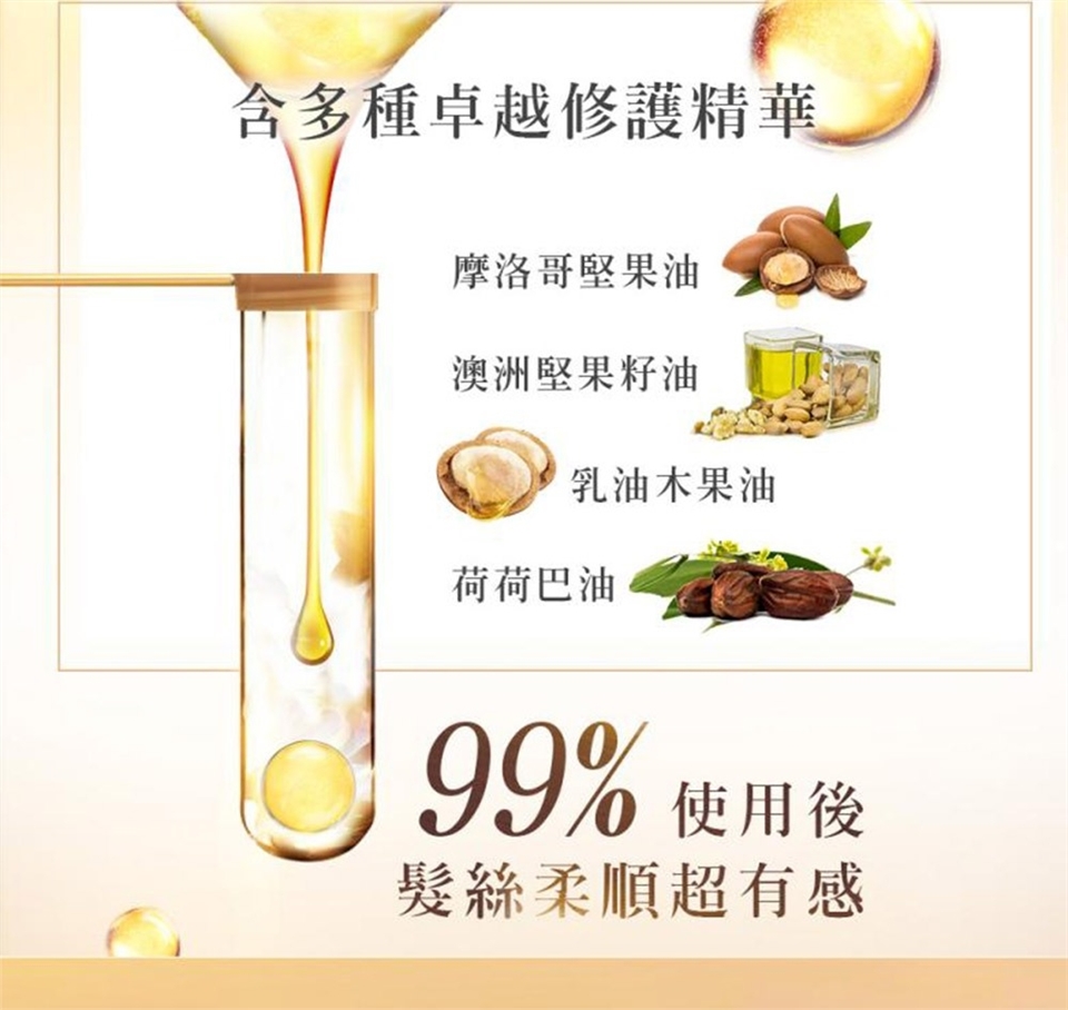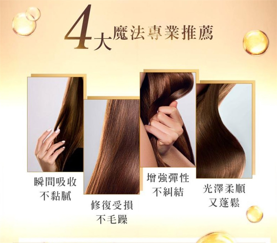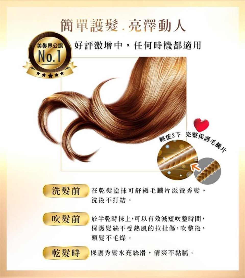 取適量均勻塗抹於濕髮或乾髮,輕輕梳理,無須沖洗,立即擁有柔順、光澤的秀髮。所有髮質均可適用。