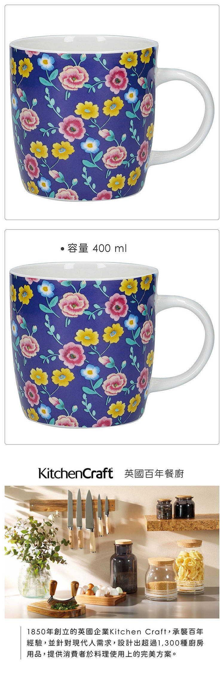 早晨享用餐點搭配鮮奶、可可,或午後啜飲咖啡、紅茶、花草茶提神,推薦您此款馬克杯。骨瓷器皿觸感溫潤,圓潤杯耳輔助舒適提拿;搭配藍底繁花圖樣予人典雅感受,是日常居家的推薦選擇。