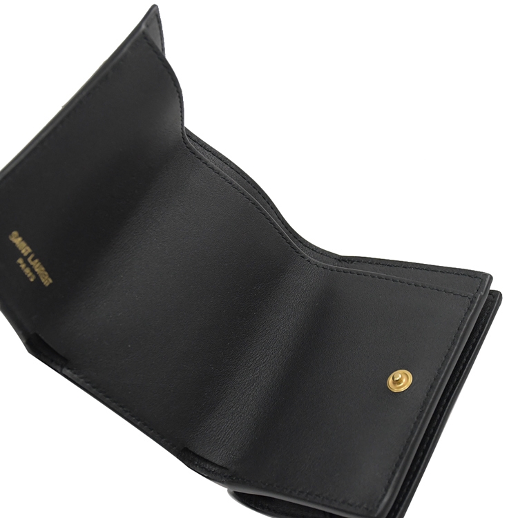 SAINT LAURENT YSL 專櫃熱賣經典短夾推新款,採用YSL金屬LOGO與質感牛皮材質,釦式開口,內有3信用卡夾層+1鈔票夾+外1釦式零錢袋提供收納,實用性高,經典牛皮觸感,高雅耐看的必備單品,美觀又實用。