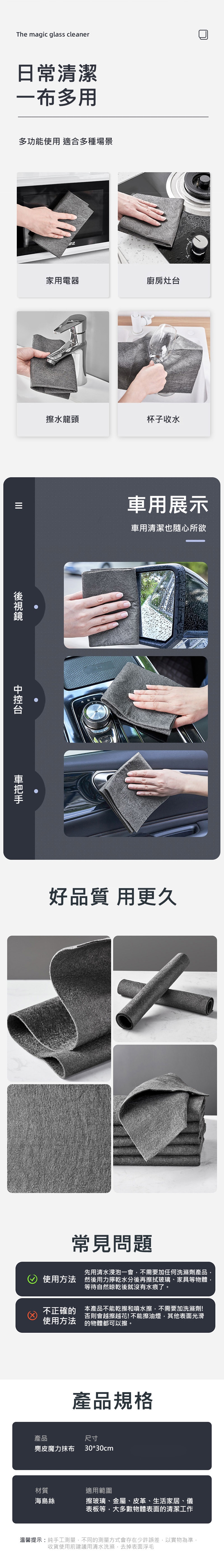 本產品不能乾擦和噴水擦,不需要加洗滌劑! 否則會越擦越花!不能擦油煙,其他表面光滑的物體都可以擦。