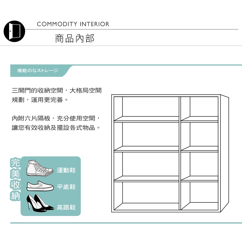 三開門收納空間設計,讓您能夠輕鬆收納各式愛鞋,整齊劃一!