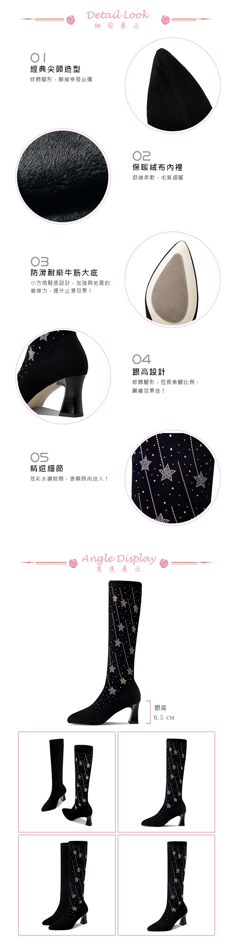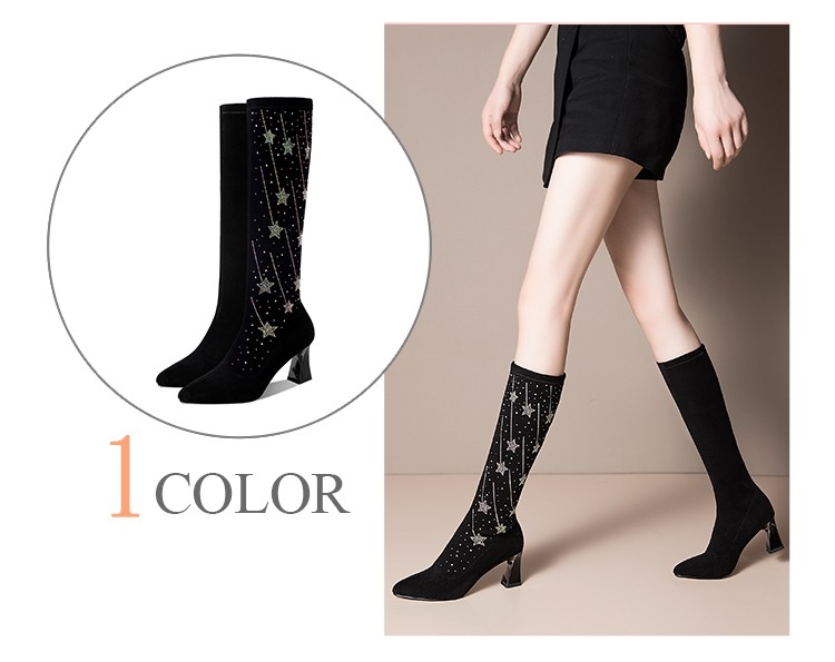 【KissXXX】長靴 高跟長靴/閃耀流星燙鑽造型彈力絨面尖頭高跟長靴 黑