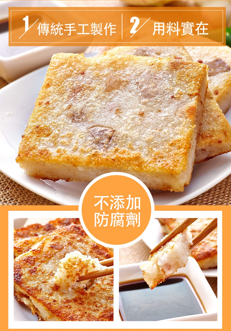 網購熱銷商品。港點中經典中的經典!現在不必跑到茶樓吃,在家就能吃到最讓人滿足的道地美味! 以優質在來米研磨成漿,與特選台灣白蘿蔔絲一起熬煮,融合香氣十足的蝦米與肉燥,全過程無人工添加香料及防腐劑,於冷卻後急速冷凍,封住食材的香氣與鮮味。 無須解凍就能直接下鍋煎,省時又方便。無添加防腐劑及人工香精,香軟綿密的口感,口口都吃的到蘿蔔的真材實料,蘸點蒜頭醬油就是最道地的古早味! 早餐、宵夜的好選擇,媽媽、上班族必備。