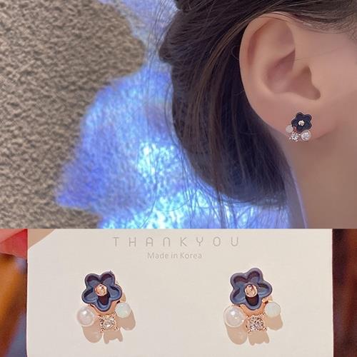 【Emi艾迷】甜美可愛藍色小花珍珠點鑽925銀針耳環