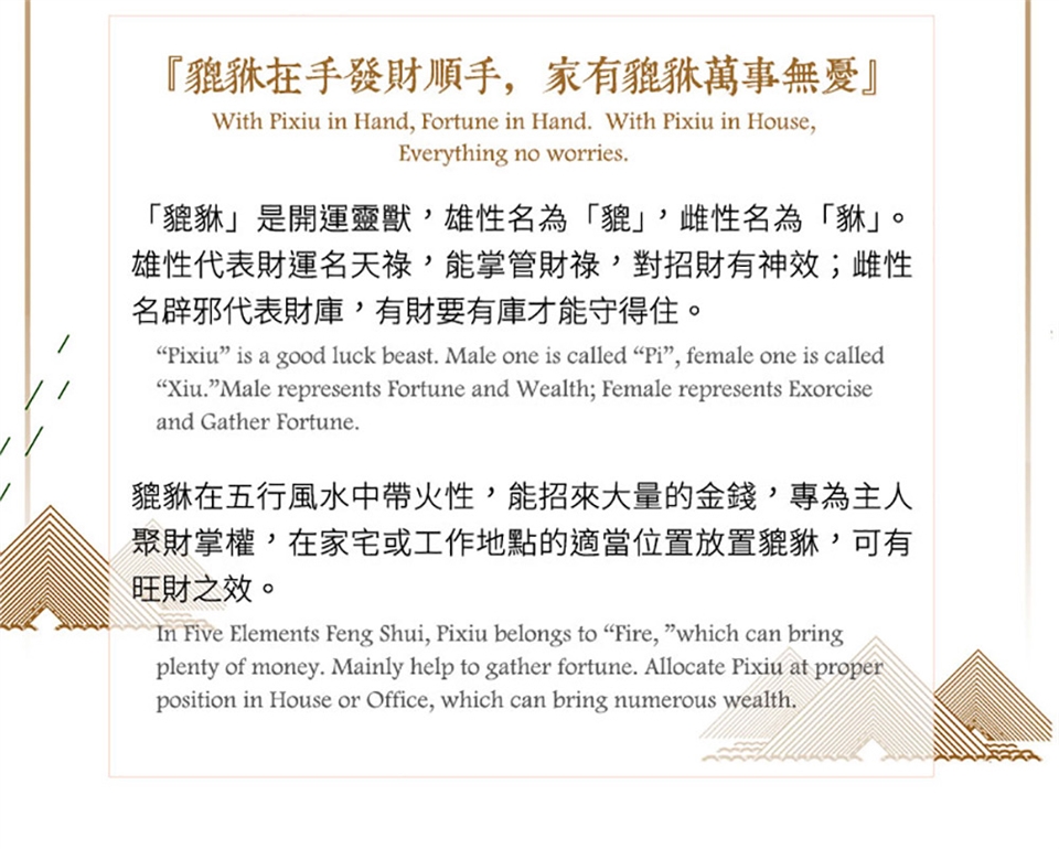 大師親自開光加持,貔貅能幫助招財納福,咬財、守庫,達到防小人、化煞、擋災、保平安之功效,是最強招財幸運物,新年納福,提升運勢整體運勢。旺事業、招業績必備。