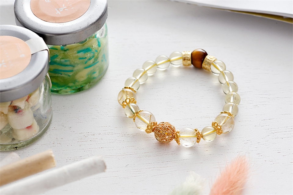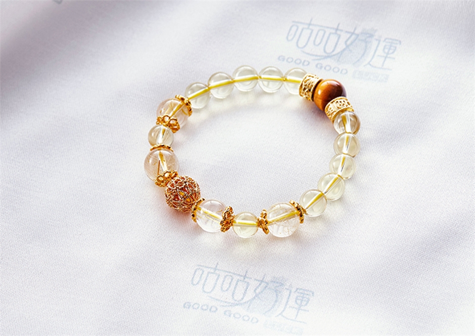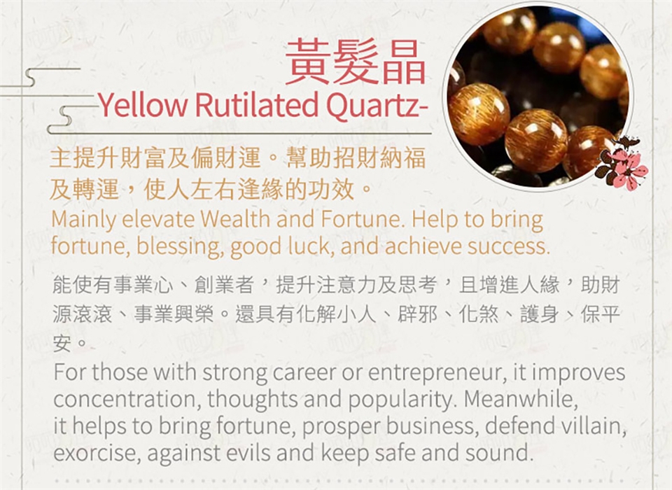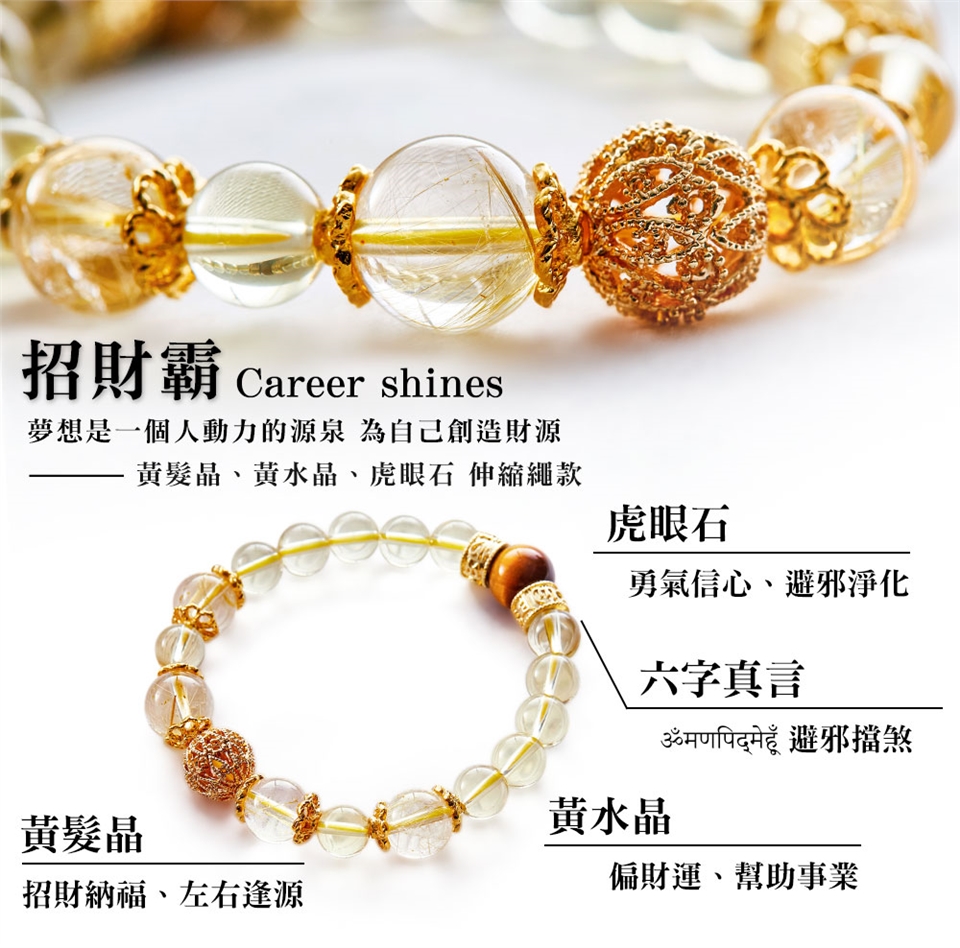 虎眼石、黃水晶、黃髮晶設計,提供你在追求財富路上所需要的勇氣、正財運、偏財運。高貴的金色外觀,配戴後可將身上不凡的氣質輕易襯托出來。