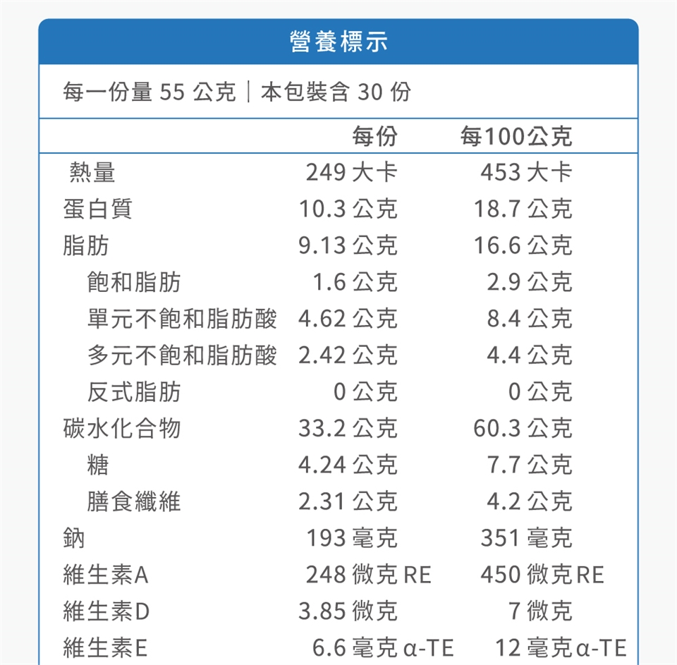 每次約取 2 匙(約 55 公克),加入已煮沸過的溫開水(50-60°C),攪拌至溶解成 250 毫升之營養液,即可提供 249 大卡的熱量及營養。