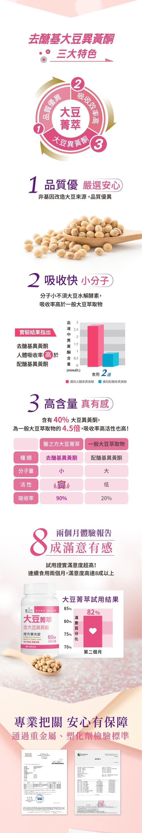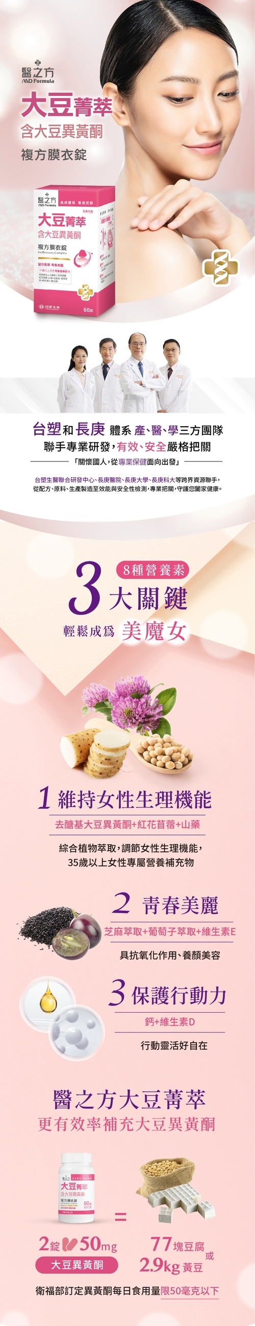 營養標示: (每一份量1錠) 維生素D 2.5微克(100IU),維生素E 3.35毫克(5IU),鈣50毫克,其他成份(每一份量1錠)大豆萃取物(含異黃酮24.2毫克),紅花苜蓿萃取物(含異黃酮0.8毫克)