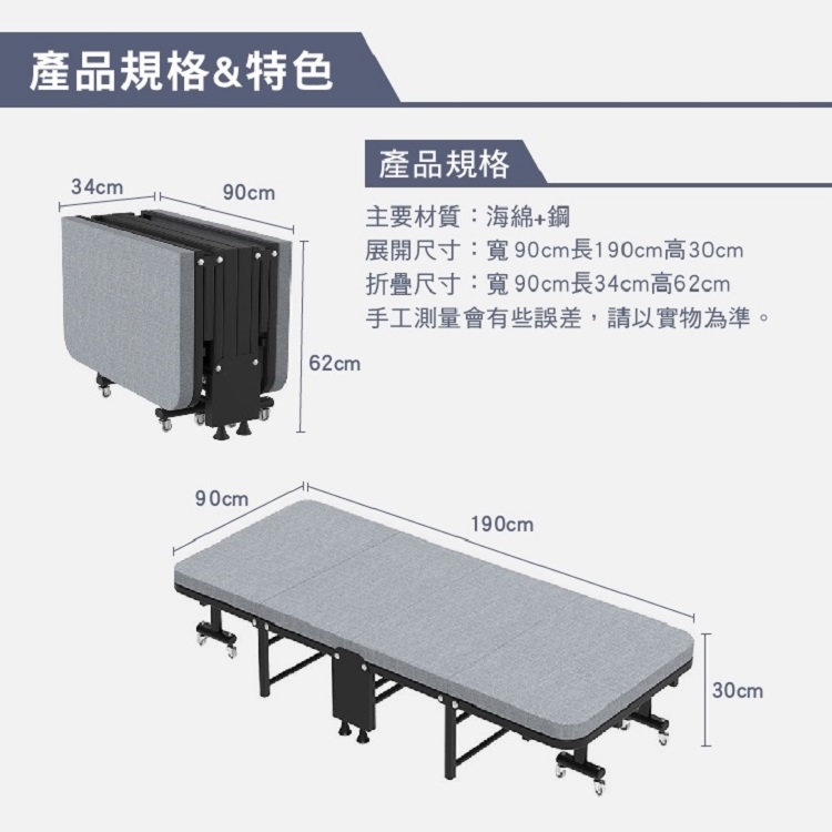 展開尺寸:190*90*30cm 折疊尺寸:90*34*62cm 24KG 承重150公斤
