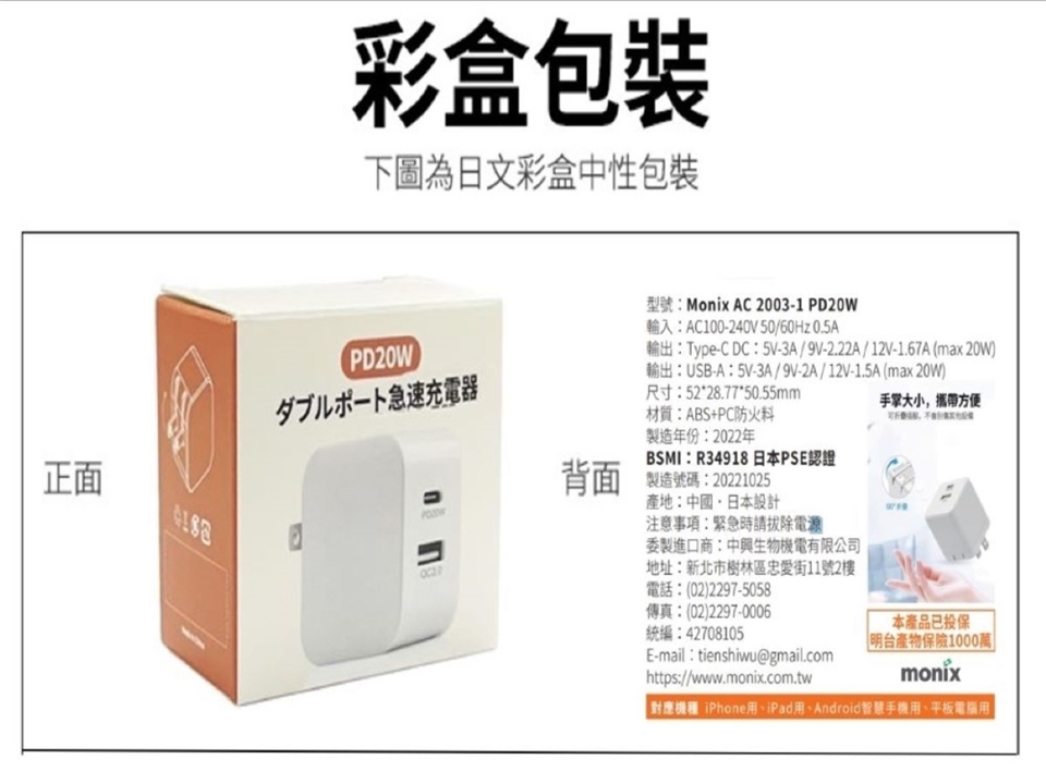 輸出:Type-C DC:5V-3A/9V-2.22A/12V-1.67A (20W max)