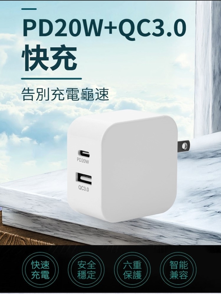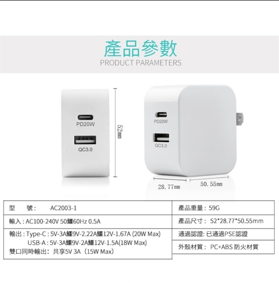 型號: AC2003-1 PD20W Type-C+QC3.0充電器