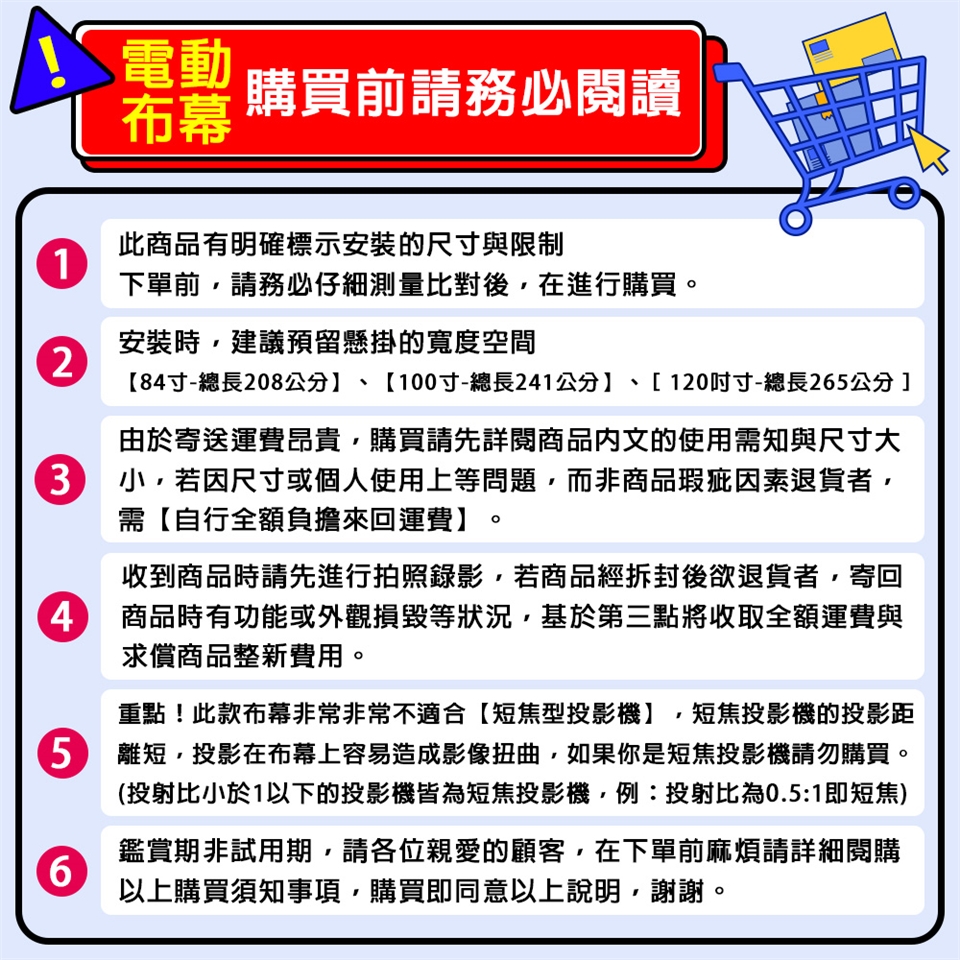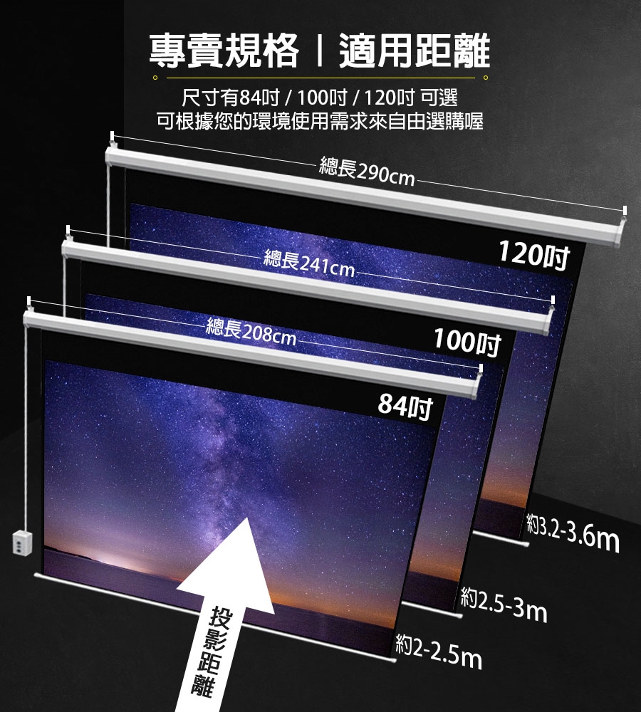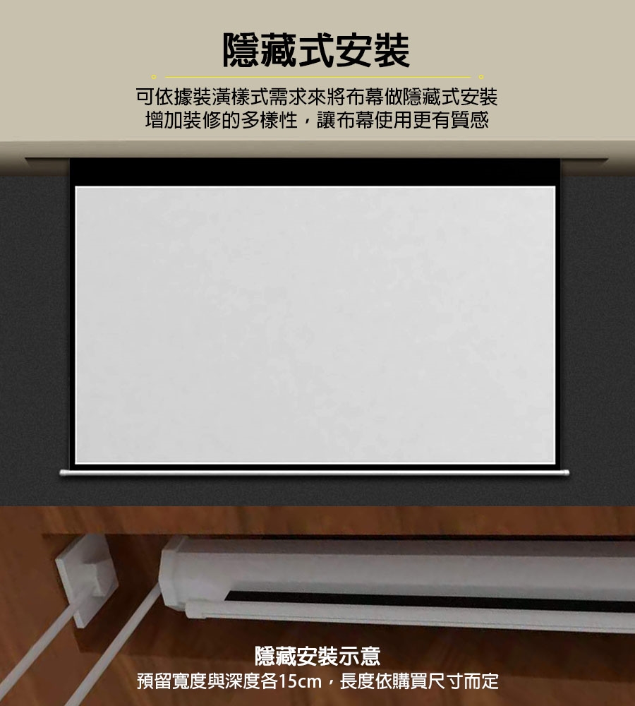 3 / 如要裝潢隱藏,預留懸掛空間【84寸-總長212公分】【100寸-總長245公分】【120吋-總長294公分】,寬與高請預留20x20cm