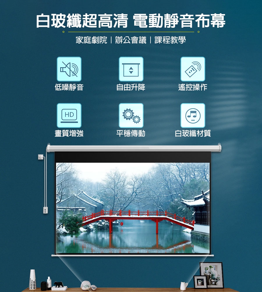 【配件】電動布幕x1、專用膨脹掛勾x2、中控遙控器x1、無線遙控器x1(內附電池)